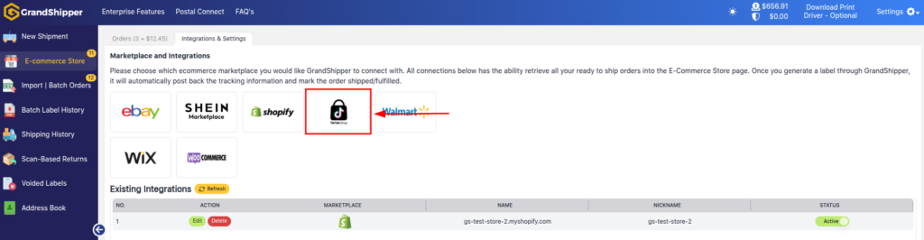 11. The page should automatically redirect back to GrandShipper if you catch in time, you can see the notification (top right) stating TikTok Shop Successfully Integrated and you can see your TikTok Shop listed.